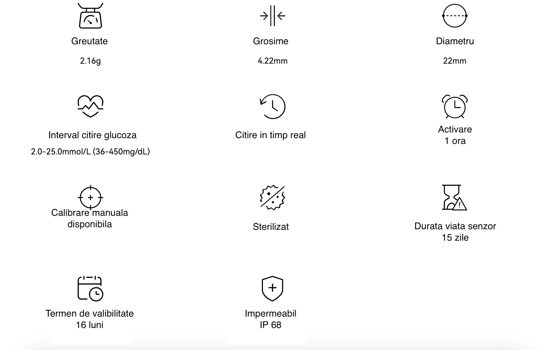 Cel mai avantajos calitate/pret tip de senzor CGM de pe piata din Romania. Aplicatia pe telefon intuitiva, genereaza rapoarte relevante legate de variatia glicemiei si predictia hemoglobinei glicate. Marele avantaj este posibilitatea calibrarii cu masuratori glicemie din deget, dar trebuie respectate instructiunile (dupa 6 ore, pe glicemie relativ stabila). De preferat aplicat senzor dimineata si neglijat primele 6 ore, altfel poate da alarme false hipoglicemice noaptea, daca nu s-a facut calibrarea. Dupa cateva calibrari, valorile CGM sunt cu 0-3 unitati la 100 mg/dl diferenta fata de masuratori din deget. Excelent in predictia glicemiei si intelegerea impactului alimantar. Recomand.
